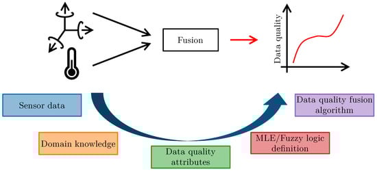 Most sensor systems consist of a microcontroller, and one or several sensors embedded in one device [1]. These sensor systems communicate with their environment through classical fieldbuses, Ethernet networks, or wireless communication systems, such as Bluetooth or wireless local area networks (WLAN) [2]. They often face constraints such as communication bandwidth or battery life, limiting the ability to measure or transmit data at high frequencies [3]. Despite these constraints, sensor systems often monitor processes and events in areas where false data could lead to dangerous decisions. Areas of application include medicine [3], robotics [4], and infrastructure [5]. Thus, we emphasize the importance of enhancing sensor systems with capabilities to monitor their current level of data quality given a set of measurements. This work presents a framework for the knowledge- and data-driven fusion of data quality attributes of sensor systems in general and MEMS-based systems in particular. We present a holistic approach that covers the definition of data quality attributes and fusion algorithms, generating a single indicator that describes the overall quality of the data. The framework allows for the use of domain and expert knowledge to define fusion algorithms for data quality indication. The algorithms compute interpretable indicators with high information content, where higher values indicate higher overall data quality. Figure 1 gives an overview of the proposed framework.