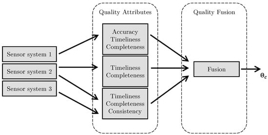 Data quality fusion architecture. Based on data from sensor systems, data quality attributes are calculated. Some attributes require input from multiple sensors. The attributes are passed into the fusion algorithm which outputs , the combined data quality indicator.