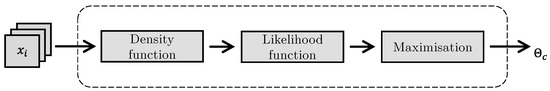 The combined likelihood function L is the product of all individual probability functions f [24]. For independently and identically distributed observations, f is constant. If this is not the case, it is necessary to derive individual distributions for every value . Here, observations represent a concrete realization of a data quality attribute and its associated metric. New observations are bound to the distributions; then the maximum likelihood parameter is obtained by maximizing L with respect to as follows [24]: