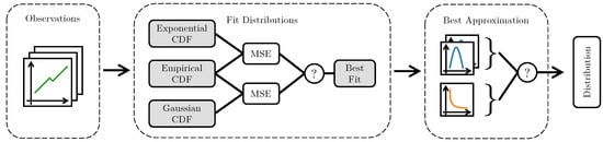 The procedure for the semi-automatic definition of fusion algorithms is shown in Figure 5. The process works as follows: First, the data containing all observations of data quality attributes or mappings of data quality levels are fitted to the supported probability distributions. The empirical cumulative distribution (CDF) is then calculated, and the goodness-of-fit is evaluated concerning the fitted distribution. The evaluation metric for the goodness of fit is based on the mean squared error (MSE) between the empirical and fitted CDF. A lower MSE indicates a better quality of the fit, and thus a superior approximation of the underlying data. If multiple measurement series are available for the same data quality attribute, this process is repeated for all series. A majority vote allows the best fit for all series to be found, counting the number of fits per supported model. The model that is counted the most is considered the best. If multiple models are available, the model parameters, such as mean and standard deviation, can be averaged to find the most representative solution. In the example in Figure 5, three sets of observations are evaluated. The step “Best Approximation” chooses the Gaussian distribution because it was found to fit the data better in two cases, whereas the exponential case was better only once.