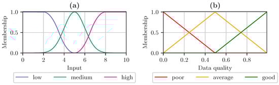 The membership functions are defined based on the inputs , representing the data quality attributes. They transform the crisp input values into the fuzzy domain. Following this step, the fuzzy inference system defines the behavior of the fusion algorithm. To assign membership functions to ranges such as high data quality, low data quality, or intermediate values medium or average, domain knowledge is used. The bounds between the ranges are subject to design decisions taken when engineering the data quality indication algorithms. Next, in the fuzzy inference step, the logical relations between the fuzzified attributes and the overall level of data quality are defined. This step is again subject to design decisions. However, it is essential to cover all permutations of defined membership functions. If this is not the case, those memberships not covered in the inference step can be omitted, because they do not add information to the final output. For a system consisting of two data quality attributes with the assigned levels high and low, a fuzzy inference system could be designed as follows: