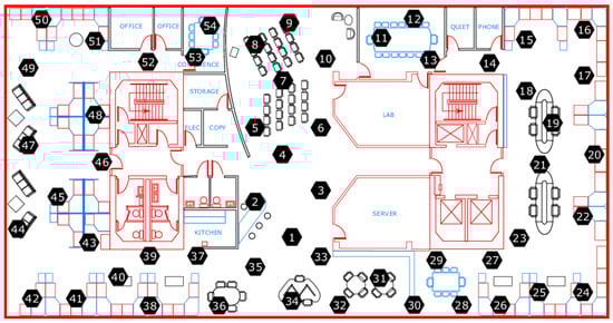 This data set was collected by Madden et al. [30] in 2004. The authors deployed 54 Mica2Dot wireless sensors equipped with weather boards to measure environmental parameters such as humidity, temperature, light, and sensor voltage at an interval of 31 s. According to the authors, there is a strong correlation between voltage and temperature variation [30]. Additionally, the data sets contain aggregated connectivity data and the x and y positions of the individual sensors in the lab. The spatial distribution of the sensors within the Intel Berkeley Research Lab is shown in Figure 7. The data sets were processed by extracting measurement points from the individual sensors, called motes. Timestamps were processed per mote and sorted in ascending order.