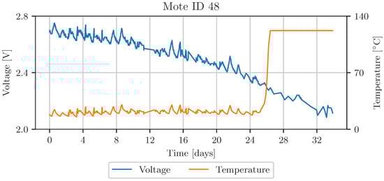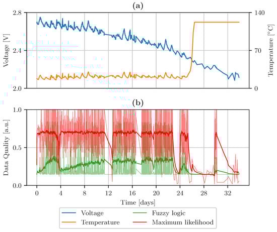 Figure 12 shows the temperature and voltage acquired by mote 48 in the upper row. The bottom row displays the aggregated data quality levels, calculated by maximum likelihood in red, and fuzzy logic-based data fusion in green. The solid lines in Figure 12b are the averaged data quality indicators, representing the general trend of the signals. The transparent parts of this graph represent the overall quality of the data. The data quality level of both fusion algorithms decreases when the voltage drops and the temperature measurement is corrupted, approximately after 26 days. An additional downtime, after 12 days, leads to worse overall data quality.
