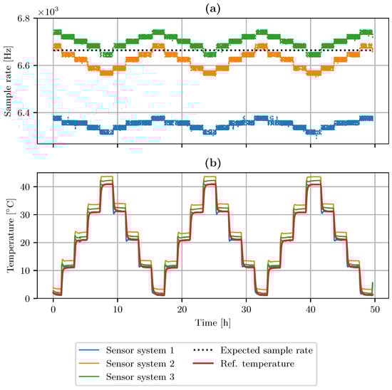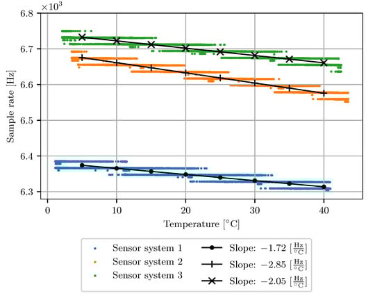 Figure 10 shows the slopes of the temperature dependency. The black lines represent fitted linear models displaying the temperature coefficient in Hz/°. All three systems show a negative temperature coefficient between −1.72 Hz/°C and −2.85 Hz/°C. The curves show that the ambient temperature influences the sample rate. However, there is a difference between individual devices in the offset and slope of temperature dependence.