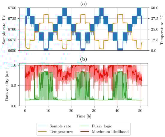 (a) Sample rate accuracy of sensor system 3 with changing temperature. (b) Data quality indicators based on fuzzy logic and maximum likelihood estimation.