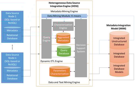 The MIM integrates metadata from different edge nodes and is extended from the previous work described in [43]. The HDSI version included in this framework includes the integration of unstructured data, updating the platform with some other techniques based on K-means and text mining. The structure of this module is shown in Figure 2. Thus, the DAE has a map of information contained in each edge node, including information about the content of each column or data set. Each module works with the same information in different ways, extracting different characteristics from the information. Metadata mining engine treats metadata from structured and unstructured data sources, the unstructured data sources are treated by the data mining module based on the K-means algorithm. This module classifies the information according to the data from the characterization engine. The dynamic ETL engine implements the extraction, transformation, and load of information, based on characterization and data source. Data and text mining engine is used for the analysis of data content in each column, extracting statistical information and identifying the foreign keys. The result of the integration of heterogeneous data sources is stored in MIM, including structured and unstructured metadata, and the user could configure if the integration of data is performed physically or only using the metadata. The HDSI is described in [43], providing details about the complete process and the role of each module.