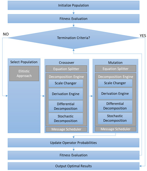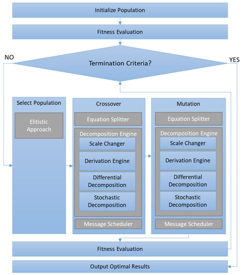 GA [48] is a bioinspired algorithm based on the search for a solution in a population, where everyone represents a possible solution to the proposed problem. Each individual is evaluated according to proximity to the solution using a fitness value. Each iteration of a new population is generated based on an elitist strategy; this means that a selection operator takes the best individuals (with the best fitness values). These individuals are mixed with other individuals by using the crossover operator, or some of them are modified with mutation operator. These operators have associated a probability following the values suggested in [49]. In this case, the operators were selected to create a high level of independence from the population, whose individuals depend on the complexity of the equation. Additionally, another level of probability is added to the crossover and mutation operators to select between each possible modification of the equation. After the application of these operators, a new population is generated and evaluated again. If the stopping criteria (the best solution is obtained with the fitness threshold) are reached, the solution is found in one or more individuals of the population. If the stopping criteria are not reached, the process starts again. A flow diagram is included in Figure 4.