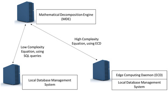 The proposed solution is composed of an engine, installed on a master node, and several ECDs, installed in different data or edge nodes, as shown in Figure 1. The Mathematical Decomposition Engine (MDE) and the Heterogeneous Data Source Integration Engine (HDSI) are the main modules of DAE, which are deployed in the master node. In the edge nodes, the ECD is installed. This daemon is configured to access data for local databases or data sets in each edge node, and it includes the information of master node address. The DAE sends commands to the different nodes to calculate the value of the proposed equation or mathematical expression.