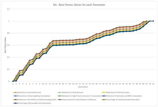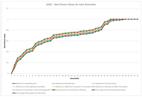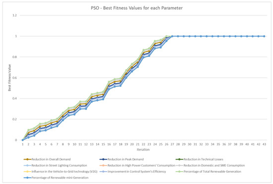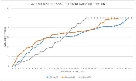 The fitness function is based on the number of steps divided by the number of binary operators. Thus, when the number of steps is equal to the number of binary operators, this means that the equation is separated at the maximum level of decomposition because it is at the parameter level. The average best fitness value for each generation (for GA and GAEC) or iteration (for PSO) is shown in Figure 8, and it is calculated for each KPI equation. As shown in Table 1, PSO was converged first, but GAEC and GAEC achieved better fitness values in the first generations. This information is more detailed in Figure 9 for the GA approach, Figure 10 for the GAEC, and Figure 11 for the PSO, showing the best fitness value in each iteration for each KPI. One of the future research lines is the inclusion of new techniques to improve the increase in fitness value in each generation or iteration.