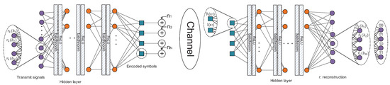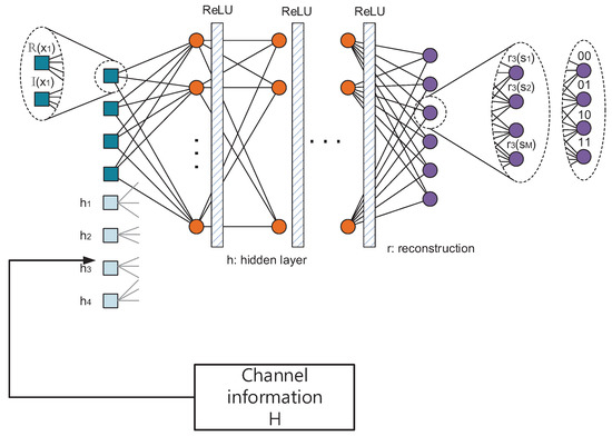Here, is the original symbol, is the l-th FC layer with weight and bias, refers to the batch norm layer and is the activation layer. Furthermore, the DNN-based decoder of the DSM system has the similar structure as the encoder. We assume that the decoder is composed of sub-blocks like the encoder such that the output of the decoder, , can be expressed as