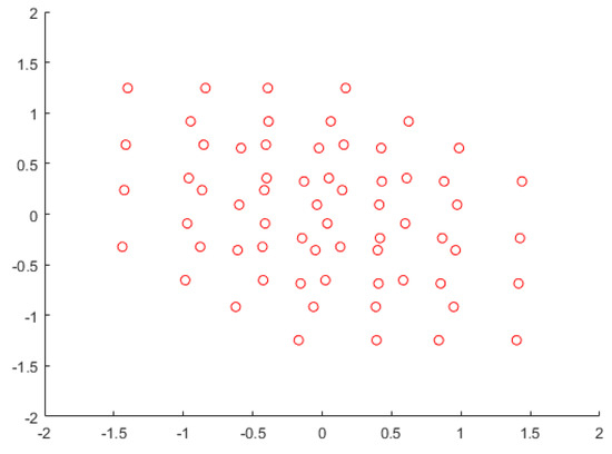 The major difference between SCMA and DSM is that the total number of possible constellation points is for SCMA and for DSM, as shown in Figure 4 and Figure 5, respectively. Figure 4 looks like a cloud of points because it has relatively many points in a limited space; however, it can still be decoded accurately by examining the received signal of other resources. The same framework can be applied to different configurations such as Figure 6 and Figure 7 as well.