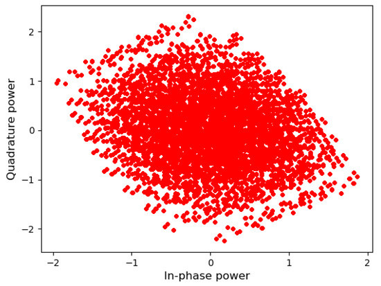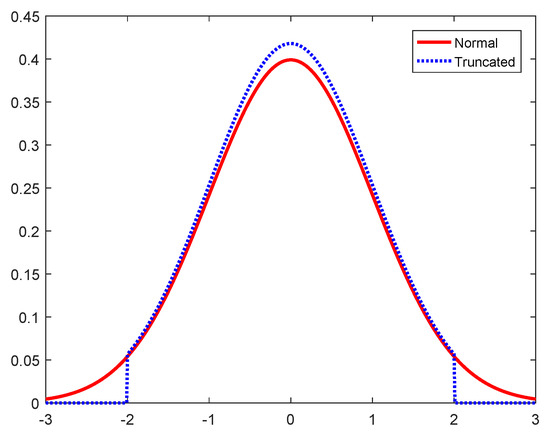 The difference of truncated Gaussian distribution and Gaussian distribution is plotted in Figure 8, where . When the noise is truncated within a certain range, we can expect that the bad training samples, i.e., received signals at constellation points which overlap the boundaries of the original symbol detection region, can be decreased.