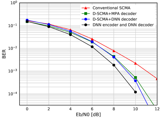 In Figure 10, we evaluate the BER performance of conventional SCMA, DNN-based SCMA and DSM. We can see that the proposed DSM (denoted with a black circle marker) outperforms the rest of schemes based on SCMA, which implies that fully connected multiplexing is better than a sparsely connected system. DSM has shown about 1 dB SNR improvement compared with other schemes in the AWGN channel.