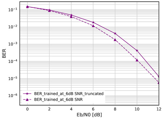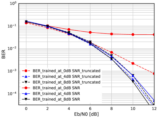 In Figure 11 and Figure 12, we evaluate the BER performance when the DSM is trained with Gaussian noise and truncated Gaussian noise. Figure 11 shows the BER when the DSM is trained with corruption level = −6 dB using Gaussian and truncated Gaussian noise, where each are the best-performing DNNs among each group. It should be noted that the truncated threshold is fixed as and = −6 dB was found by exhaustive search. We can see that the DSM trained with pure Gaussian is better than that with truncated Gaussian. On the other hand, for large corruption levels such as = 0 or −4 dB, as shown in Figure 12, the DSM with truncated Gaussian noise is trained better than that with pure Gaussian noise.