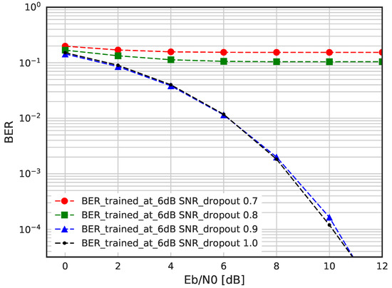 In Figure 13, we evaluate BER performance of DSM when dropout is applied, which prevents the overfitting. As we can see from the result, as the dropout rate decreases below 0.9, DNN cannot function as encoder and decoder. Therefore, we can see that the proposed DNN based encoder and decoder does not suffer from overfitting problem. The use of enough training data and the proper stoppage point on training epochs have helped to avoid overfitting problem.