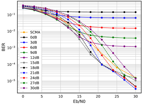 In Figure 14, we evaluate BER performance of channel information-aided DSM and compare it with SCMA in the Rayleigh fading channel environment. Unlike the AWGN channel results, the BER performance of the trained DSM varies heavily depending on the corruption level. Since the multipath fading channel has a much larger variance compared to the AWGN channel, the proper selection of corruption level is very important and, as can be seen from the results, the −15 dB, −18 dB and −21 dB corruption levels are best for training the DNN-based encoder and decoder.