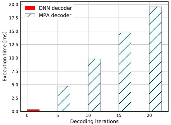 In Figure 15, the complexity of conventional MPA detection and the DNN-based detector are evaluated. The complexity of the conventional MPA scheme is proportional to the number of message-passing update iteration, I, which can be expressed as [13] while the DNN decoder has where refers to the number of superposed layers in a resource. As can be seen, the experimental results verify the practical usage of the DNN-based encoder and decoder.