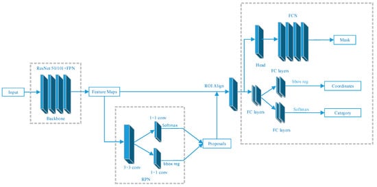 Mask R-CNN uses a two-stage target detection method. In the first stage, the proposals are obtained through the Region Proposal Network (RPN). In the second stage, the features of target locations are obtained based on the proposal and regions of interest generated in the first stage, and finally classification, localization, and mask prediction are performed.