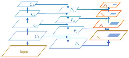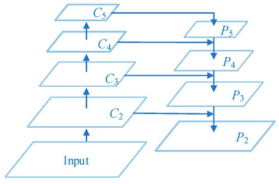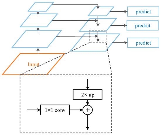 Feature Pyramid Network (FPN) is a network topology that aggregates higher-level features with lower-level features, allowing the model to learn information that retains both location and stronger semantic information []. Its network topology is shown in Figure 7. It can be observed that the FPNs are predicted by up-sampling the higher-level feature maps and then superimposing them horizontally with the semantic information at lower levels than them. This results in a feature map with strong semantic information and thus achieves the effect of feature fusion.