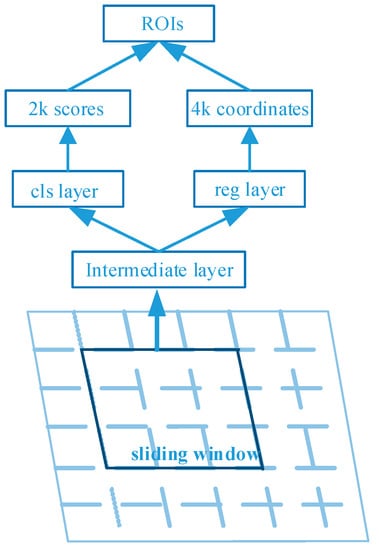 The RPN network takes anchors on the feature map to calculate the positions of proposals, and the principle of anchor generation is shown in Figure 3. A sliding window of n × n is set on the feature map to generate k identically centered anchors corresponding to each point in the feature map. To fit various sizes of targets, the anchor is set to 3 area sizes as well as 3 aspect ratios, for a total of 9 sizes; thus k = 9. Then, the sliding window is used to convolute the feature map, and the classification layer and regression layer composed of a fully connected network are respectively input through the middle layer to describe the position and type of information of the anchor. The classification layer outputs 2k fore-and-aft probability values, and the regression layer outputs 4k coordinate values. The RPN corrects the length, width, and center of each anchor based on the correction values calculated by the regression, and the corrected RoIs are sent to the subsequent network after filtering.