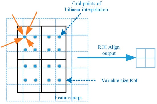 RoI Align serves to pool the corresponding regions in the feature maps into fixed-size feature maps based on the location coordinates of the RoIs for subsequent classification and regression operations. The whole feature aggregation process is transformed into a continuous operation by canceling the quantization operation and using bilinear interpolation [] to obtain the values on the pixel points with floating point coordinates. The operation process is as follows: