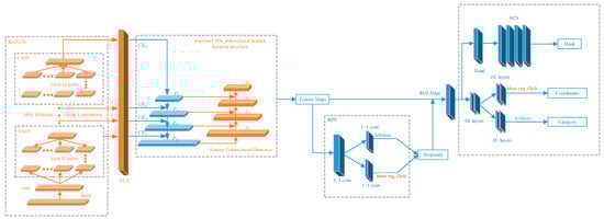 Improved Mask R-CNN model structure: the orange part shows the improvement points proposed in this paper.