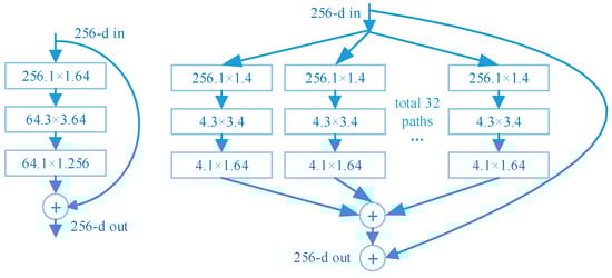 The ResNeXt network proposes a parallel stacking of blocks with the same topology instead of the original ResNet block with three convolutional layers []. The concept of cardinality is introduced in the block, which refers to the number of identical branches in a block. The accuracy of the model is improved without significantly increasing the number of parameters, and the hyperparameters are also reduced due to the same topology, which makes it easier to port the model. As shown in Figure 6, the ResNet network structure is shown on the left and the ResNeXt structure is shown on the right.