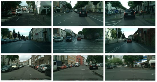 For this study, we selected part of the CityScapes dataset and divided the dataset into a training set, validation set, and test set according to the ratio of 7:1.5:1.5. Among them, the training set included 2334 images, the validation set included 500 images, and the test set included 500 images. The CityScapes dataset included 30 categories, considering the application scenario of this study was a traffic scenario; therefore, this study only detected 5 categories in the dataset, which were car, pedestrian, truck, bus, and rider. The CityScapes dataset is shown in Figure 10.