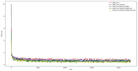 When training the improved Mask R-CNN model, the change curve of the loss function was plotted by the information of the result of each training round, as shown in Figure 11. As can be seen in the figure, the total loss values of the five groups of models converged at 22,200 training iterations. Compared with the other four groups of models, the loss function curve (yellow curve) of the improved Mask R-CNN model proposed in this paper significantly improved in convergence.