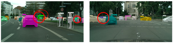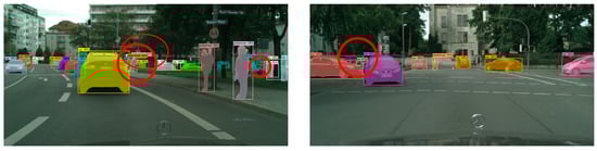 Comparing the experimental results of the CityScapes test dataset, we found that in the original Mask R-CNN test results, although the model could detect different kinds of targets well, there were some false detections and poor mask quality. In the test results of the improved Mask R-CNN, it was able to detect different kinds of dense targets better. The mask segmentation results with good quality were also presented for the targets with serious occlusion. In the left experimental group, the dense targets in the middle and the right side of the picture had partial false detection. In the right experimental group, the masks of the two dense small targets on the left side of the picture were not of high quality, and although the targets were correctly identified as cars, the masks showed a confusing situation.