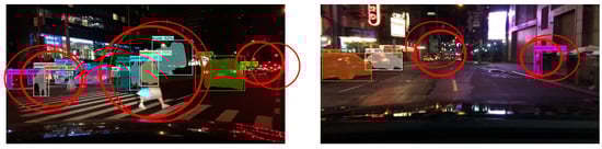 The detection and segmentation of targets in front of vehicles in dark scenes is difficult due to the influence of light. There may be a large number of false detections and missed detections in the recognition process, and the segmentation accuracy of the model is required to be very high. Therefore, in this set of experiments, we selected the images of darker night scenes in the BDD dataset for testing. Compared with the experimental results, we can see that there were more false detections and missed detections in the original Mask R-CNN test results, and the mask quality was not high as well. The improved Mask R-CNN could better detect multiple targets in front of the road in the dark scene, and the mask quality of each target was better.