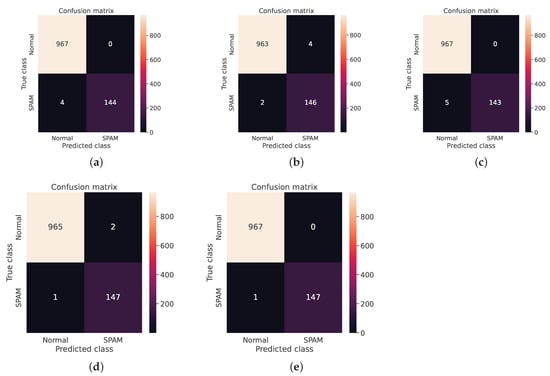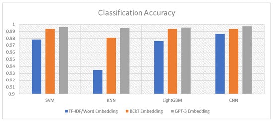 As mentioned in the model description, the four classifiers with the best accuracies were selected to be part of the ensemble module. These four classifiers were the SVM, KNN, LightGBM, and CNN. Figure 3 shows the performance of each of these classifiers with the three embedding methods and confirms that the GPT-3-based embedding outperformed the other methods for all classifiers. Regarding Weighted Voting, Table 3 shows that the classification results of this technique are very interesting and outperformed all other classifiers. The final output of the Weighted Voting reached an Accuracy of 0.999103, a Precision of 1, a Recall of 0.993243, and an F1-score of 0.996610. To give an idea of the distribution of the classification results, we present in Figure 4 the confusion matrix of the four classifiers and the Weighted Voting classification.