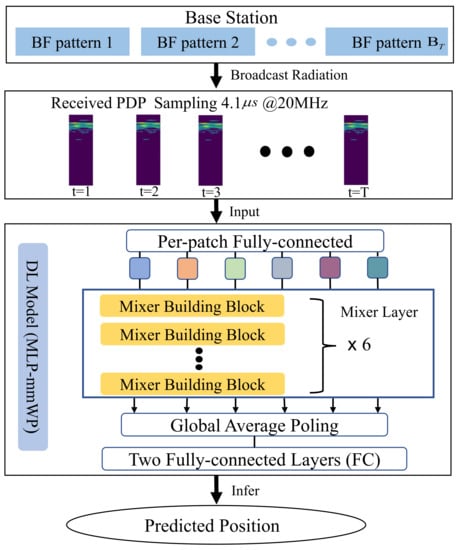 In contrast to the methods mentioned above, some researchers have used novel network models with beamformed fingerprints, which are multilayer perceptron mixer (MLP-Mixer) neural networks. MLP-Mixer uses numerous multilayer perceptrons (MLPs) to replace the convolution operation (Conv) in traditional CNNs and the self-attention mechanism in the transformer. Many scholars have employed this method to solve computer vision issues, as its linear timing sequence simplifies the operation structure and improves operational efficiency. We used this method to verify our novel deep learning structure, which is suitable for localization. In this study, a novel MLP-Mixer [30] architecture is proposed to achieve the accurate positioning of mobile devices, which depends on BFFs. Our contributions are summarized as follows: