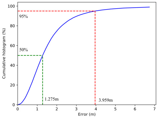Figure 3. The error-cumulative histogram of the proposed MLP-mmWP method (employing sequences of seven BFFs and with a noise level of σ = 6 dB). The green dotted line is the median error and the red dotted line represents the 95th percentile error.