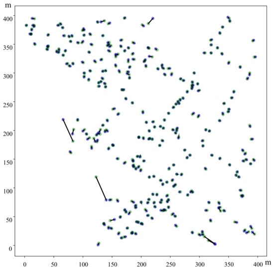 Figure 4. Error visualization of 300 randomized testing samples. The green points represent the reference locations, and the blue points denote the locations predicted by the proposed method. The black lines represent the deviation between the reference locations and predicted locations.