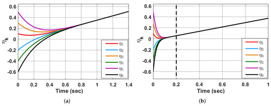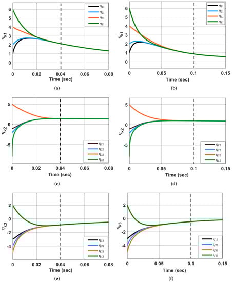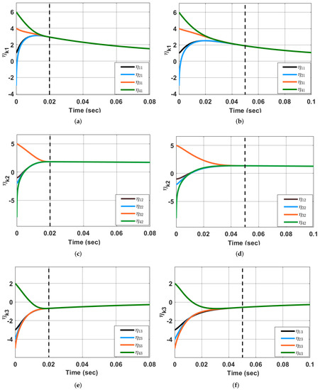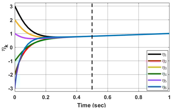 From Figure 1, one can visualize that the states of the agents converge with respect to each other in sec and sec, which is predefined. Further, the MAS (1) undergoes synchronization using the adaptive state-feedback controller (44) (when ) in predefined-time considering , and