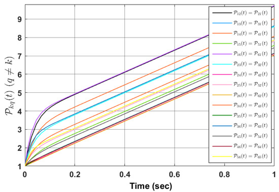 Simulation outcomes validate that agents’ synchronization with respect to each other occurs in the predefined time . Figure 3 shows the evolution of with time.