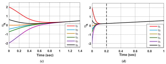 Furthermore, a comparison is made with the finite-time state-feedback controller designed in [51] considering this Kuramoto model. Simulation results in Figure 6a,c shows the finite-time synchronization of the agents where the time of convergence (convergence time) changes with the change in the initial conditions. As in Figure 6a, the initial conditions of the 6 agents of Kuramoto model (2) are respectively, and the time of convergence using the state feedback controller in [51] is around s. Whereas in Figure 6c, as the initial conditions of the agents are changed to , convergence time changes to 1.2 s. While in Figure 6b,d, using the controller (32), with the predefined-time chosen as 0.2 s, synchronization occurs at 0.2 s (predefined-time chosen a priori), irrespective of the change in initial conditions. The initial conditions chosen for simulation in Figure 6a,b are and for Figure 6c,d are respectively for agents 1 to 6 of Kuramoto model (2). Thus, one can say that the proposed technique provides better results than finite-time techniques existing in the literature in the sense that the convergence time in the former case can be chosen in advance, while the convergence time in the latter case changes with the change in the initial conditions and cannot be chosen a priori.
