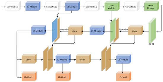 Existing deep learning-based object detection algorithms can be divided into two categories: one-stage detection algorithms and two-stage detection algorithms. R-CNN [5], SPPNet [6], Fast RCNN [7], etc., are examples of typical two-stage detection algorithms; SSD [8], RetinaNet [9], YOLO [10], etc., are examples of typical one-stage detection techniques. Zuo et al. [11] applied Faster R-CNN to traffic sign detection. The YOLOv3 network was introduced by Shehan P. Rajendran et al. [12] for the purpose of detecting traffic signs. To better detect traffic signs, Li et al. [13] integrated an attention mechanism with a YOLOv4 network. These algorithms have achieved some achievements in the task of traffic sign detection, but due to the small size of traffic signs, variable imaging angles, and complex lighting environment in real scenarios, the detection accuracy and speed still cannot reach a reasonable level. YOLOv5 [14] is a network with superior overall performance, but the accuracy of detecting small traffic signs in complex environments is low. To address these problems, this paper proposes a new network based on YOLOv5s, called TRD-YOLO (Trans-Decoupled YOLO), the structure of which is shown in Figure 1. Fusing the Transformer mechanism [15] and convolutional neural network (CNN) and proposed a new lightweight decoupled head to enhance the output capability of the network.