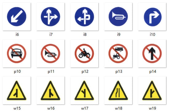 TT100K dataset contains 221 categories of traffic signs, and the resolution of each data sample is 2048 × 2048. The original dataset has a total of 6107 training data and 3073 test data. According to the experimental analysis, there are a large number of traffic signs with a very low proportion in the native dataset, which cannot be learned effectively. To address this problem, we analyse the number of various types of traffic signs in the dataset, and select 45 categories of traffic signs with a number more than 100 to balance the sample discrepancy caused by different categories of traffic signs in the dataset. The example of the dataset is shown in Figure 5, and the category names are shown in Table 1, where the signs starting with “w” are warning signs, the signs starting with “p” are forbidden signs, the signs starting with “i” are indicating signs, and the flags ending with * indicate the numerical value, such as pl50, pl60, and pl100.