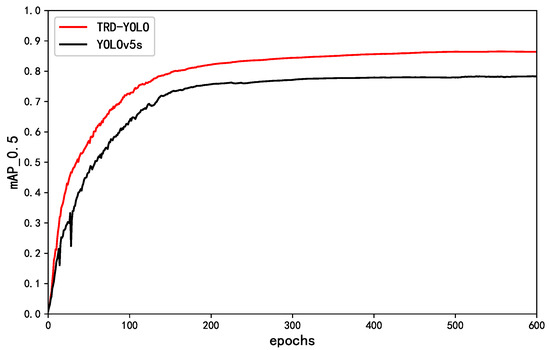 Figure 6 shows the comparison of the training process between the TRD-YOLO model and the YOLOv5s model, from which it can be seen that TRD-YOLO has strong learning ability at the beginning of training, and the training process is faster and smoother than convergence. The above comparison shows that the proposed method has good performance.