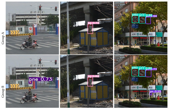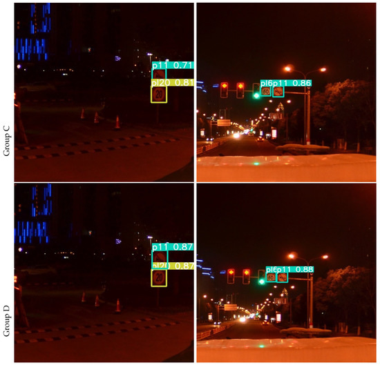 The results of the ablation experiment on the TT100K dataset are visualized as shown in Figure 8 and Figure 9. Group A and C pictures show the detection results of YOLOv5s, the picture in Group B and D shows the TRD-YOLO detection results. When traffic signs are very small, deformed, occluded, or in night scenes, YOLOv5s often have problems with missed detection, false detection, or low confidence, while TRD-YOLO can accurately locate and classify each traffic sign and detect it with high confidence. As shown in the left column, YOLOv5s missed a “pne” traffic sign, while TRD-YOLO accurately detected it. As shown in the middle column, when faced with deformed traffic sign, YOLOv5s cannot judge it with certainty, while TRD-YOLO detects it with a confidence rate of 0.84, which is 0.1 higher than YOLOv5s. As shown in the right column, when the traffic sign is backlit or occluded, the detection capability of YOLOv5s is greatly reduced, will missed detection and with low confidence, while TRD-YOLO can extract richer features with the ability of global feature extraction, enhance context aware and rely on a more powerful decoupled head for detection. As can be seen from Figure 9, the detection ability of YOLOv5s is weaker than that of TRD-YOLO in the night scene.