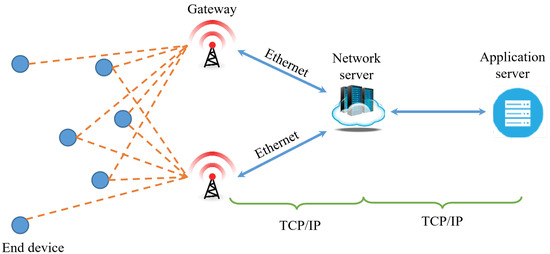 Among the technologies of LPWAN, LoRa networking is predominantly deployed in LPWAN applications because it is based on an open-source and unlicensed industrial, scientific, and medical (ISM) sub-GHz band that enables autonomous network set up at a low cost. The property of LoRa makes it compatible with IoT applications such as smart cities, smart farming, and smart homes [8,9]. LoRaWAN is the standard MAC layer for LoRa, which adopts the star of stars topology, as shown in Figure 1. In this topology, end devices communicate with servers on the Internet via gateways to deliver their own data. LoRaWAN MAC exploits ALOHA MAC and time-division multiple access (TDMA) modes to divide the airtime between end devices for communications.