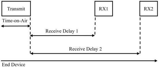 Class A: This class of LoRaWAN devices has the lowest power consumption. Class A devices spend most of their time in sleep mode [21,22]. In Class A, after the device sends an uplink, it listens for a message from the receive windows RX1 and RX2 after the uplink before going back to sleep, as shown in Figure 2.