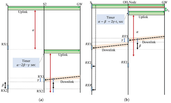 Figure 3 shows LoRaWAN uplink and downlink transactions. It is important to note that LoRa networks are generally not designed for delay-constrained communication. Figure 3a depicts a regular LoRaWAN message transmission, in which, if the source (S) delivers eight consecutive Class A uplinks to the gateway (GW) without receiving an ACK frame on the RX1 or RX2 receive window, the node will go back to sleep mode until the next time it has data to report. Nevertheless, the source node (S2), which is closer to the GW, transmits an uplink at T(timer) = seconds and receives an acknowledgment at the receive window RX1, where represents the retransmission time, stands for the propagation delay (depends on distance), and means the time slot length in one window (depends on the size of the packet). Figure 3b represents the message forwarding mechanism used in the proposed scheme, where a distant source node (S) is seemingly out of coverage from the GW and transmits a Class A uplink to the network server, and, if the packet is not successfully received, the GW manages the periodically listening nodes to select the best OH node among the candidate set to forward the overheard packet at T = seconds. Herein, the GW shall reply on the RX1 or RX2 window of the OH node. The OH node will repeat the downlink to S on the RX1/2 windows or an extra RXR window.