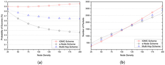 Plots of the performance evaluation metrics: the probability of success and number of packets against node density of various schemes. (a) The probability of success as a function of node density. (b) The number of packets as a function of node density.