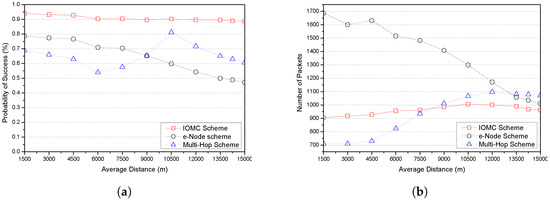 Figure 6 shows the variations in the average distance with the probability of success and the number of packets. In general, there is a decrease in the probability of success with increasing average distances for all the schemes, as shown in Figure 6a. This is attributed to a high probability of collision and capture effect, where messages sent by LoRa nodes that are furthest from the GW experience the highest packet loss ratio (PLR) and longest time on air (ToA), and nodes closest to the GW can choose among multiple low SF values. Therefore, it is likely that the furthest ones can only select the highest SFs for transmission [17]. The noted increase in the multi-hop scheme within the average distances of 6000 to 10,500 (m) could be brought about by the availability of relays that play a fundamental role in successfully delivering messages to the final destination, which also corresponds to [50]. Whereas, in the region between 10,500 and 15,000 (m), there is a performance degradation as a result of a poor link, which does not necessitate an efficient frame transmission to both the relay and GW, similar to the e-node scheme. The findings further show that the IOMC scheme exhibits the best performance over along with various average distances from the GW. This could be due to the significantly increased number of OH nodes that retransmit all the failed transmissions to the GW; this bridges the gap of unsuccessful transmissions.