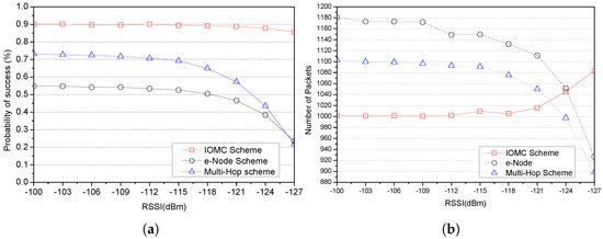 However, the IOMC scheme showed a steadily high performance until the threshold RSSI value of −120 (dBm). Beyond this point, as the RSSI values deteriorated, the probability of success for the IOMC scheme slightly decreased, but not to the extent of the e-node and multi-hop schemes. This could be attributed to the selection strategy of OH nodes with better link quality to retransmit failed messages. In addition, comparing the probability of success of a multi-hop scheme and an e-node scheme with a high node density, the multi-hop scheme achieves a better result in terms of deploying relays to provide substantial benefits in forwarding packets to the GW. Contrary, the e-node scheme’s poor link quality leads to a path loss to the source node, which obviously affects the overhearing of the e-node statically located in the sensor field.