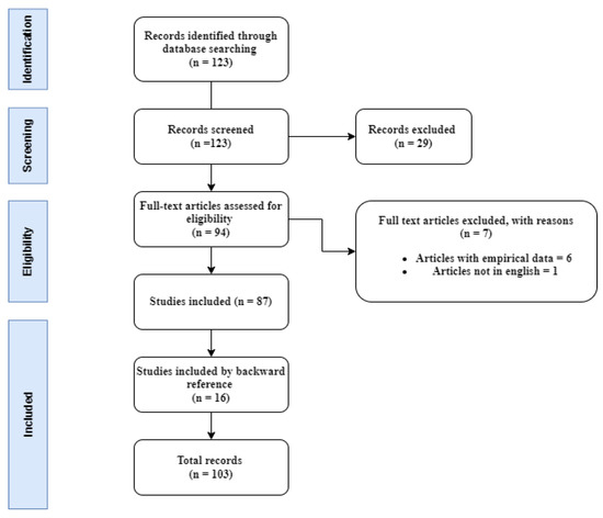 A total of 123 articles from the search were screened and assessed based on the title and abstract. We excluded articles not focusing on smart transportation applications, architectures, and technologies, reducing the number of relevant articles to 94. The selected papers were downloaded and read in full. A second assessment was made based on the following criteria. The first criteria excluded articles that provide no empirical data, such as abstracts, editorials, conference summaries, short papers, and book chapters. Second, all non-English written articles were excluded. Third, similar duplicate articles were removed. After these criteria had been fulfilled, 87 articles remained. After these selections had been made and downloaded, we conducted a further backward reference search to learn more about this body of knowledge development. This method analyzed the citations in the selected articles related to the terms searched earlier. By doing that, we included 16 more articles resulting in a total of In total 103 reviewed articles, as depicted in