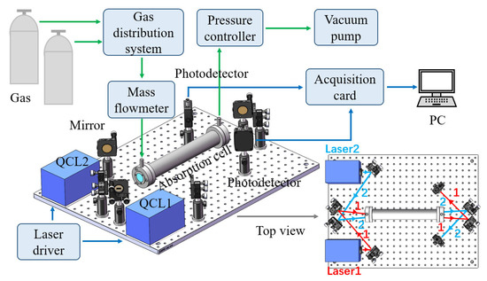 Non-dispersive infrared (NDIR) and differential optical absorption spectroscopy (DOAS) are common measurement methods for the simultaneous measurement of the two gases [17,18,19]. However, the process of measuring NO2 is highly dependent on the algorithm and is subject to many interfering factors. There are also different problems in the application of the direct measurement of NO2 in different industries. Laser absorption spectroscopy technology is based on the Lambert–Beer law, and it is a common method for the detection of trace gases [20,21,22]. With the continuous development of laser technology, the quantum cascade laser (QCL) has extended the measurement band of gas to the mid-infrared region, where there is a stronger absorption strength and more spectral lines [23,24,25,26,27]. Based on these advantages, quantum cascade laser absorption spectroscopy (QCLAS) can provide faster and more accurate monitoring capabilities, and it has become a research hotspot [28]. It has been applied in the fields of environmental monitoring, industrial processes, respiratory gases, and so on [29,30,31,32].